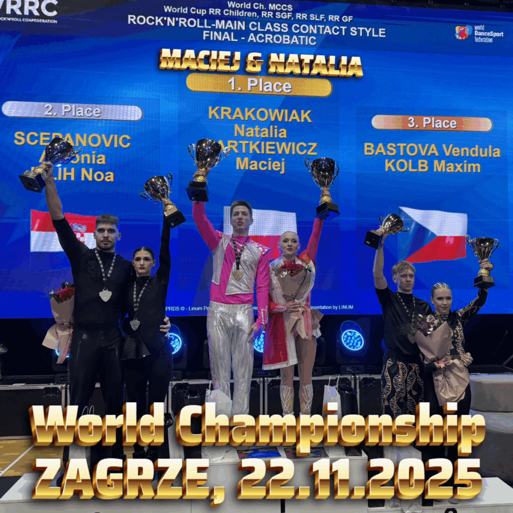 🥇 Mistrzostwo Świata dla Macieja Bartkiewicza i Natalii Krakowiak! 22 listopada 2025 – Zagrzeb, ChorwacjaTen dzień przejdzie do historii naszego klubu. Para Maciej Bartkiewicz & Natalia Krakowiak zdobyła Mistrzostwo Świata w Rock’n’Rollu Akrobatycznym w kategorii Main Class Contact Style, sięgając po tytuł najlepszych zawodników na świecie. To niezwykły sukces, który potwierdza ich absolutną dominację na światowej scenie. Maciek i Natalia od lat reprezentują najwyższy poziom – ich technika, styl, siła akrobatyczna i charakterystyczna energia sceniczna sprawiają, że są jedną z najbardziej rozpoznawalnych par w Europie i na świecie. W Zagrzebiu pokazali taniec kompletny – dynamiczny, perfekcyjny i niezwykle emocjonalny. Każdy element choreografii był dopracowany do granic możliwości. Ich finałowy występ został nagrodzony przez publiczność ogromną owacją. To złoto to efekt ogromnej pracy, setek godzin treningów, perfekcyjnej organizacji i wielkiego talentu. Jesteśmy niesamowicie dumni, że tak wybitni sportowcy reprezentują barwy SKT Mega Dance i Zielonej Góry. Maciek i Natalia – jesteście legendą. Dziękujemy! 💛💚 Świetny występ naszej drugiej pary – Dawid Sadowski & Agnieszka Borowa Obok mistrzów świata, na parkiecie w Zagrzebiu zaprezentowała się także nasza para Dawid Sadowski & Agnieszka Borowa, która w kategorii Main Class Contact Style zajęła 33. miejsce. To bardzo dobry wynik w jednej z najtrudniejszych i najmocniej obsadzonych kategorii na świecie. Dawid i Agnieszka pokazali ogromny charakter, waleczność i świetnie zaprezentowali się w swoim stylu. Z roku na rok robią ogromne postępy i stają się coraz silniejszą parą na arenie międzynarodowej. Gratulujemy i dziękujemy za piękną reprezentację naszego klubu na imprezie najwyższej rangi! 💛💚 Duma Mega Dance! Złoty medal Macieja i Natalii oraz świetny występ Dawida i Agnieszki potwierdzają, że SKT Mega Dance jest jednym z najsilniejszych ośrodków Rock’n’Rolla Akrobatycznego w Polsce i Europie.To była wyjątkowa niedziela – i kolejny rozdział w wielkiej historii naszego klubu.